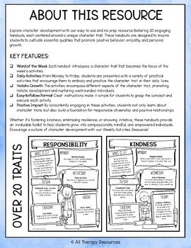 Explore character development with our easy to use and no prep resource featuring 20 engaging handouts, each centered around a unique character trait. These handouts are designed to inspire students to cultivate essential qualities that promote positive behavior, empathy, and personal growth.